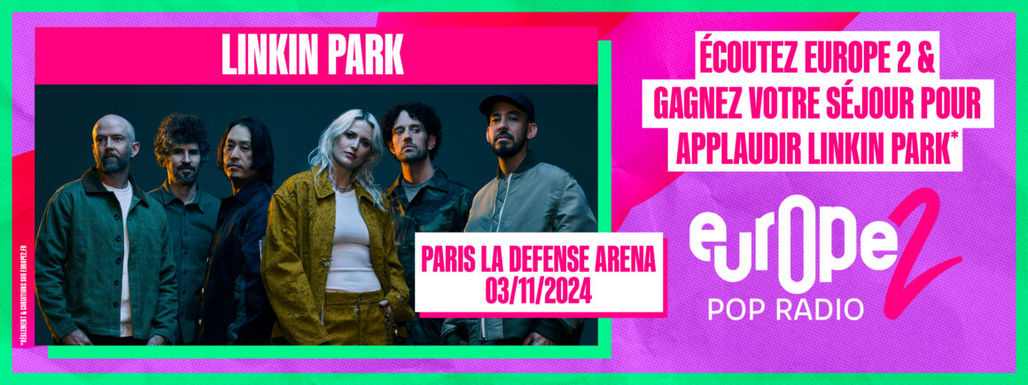 Europe 2 vous envoie à Paris pour mieux assister au concert (très) attendu de Linkin Park ! Pour avoir une chance de gagner, il vous suffit d’envoyer le code CONCERT au 7 12 13 (3×0,75 cts + prix du SMS) ! Si vous êtes tiré(e) au sort, vous filerez tout droit à Paris pour applaudir Linkin Park.