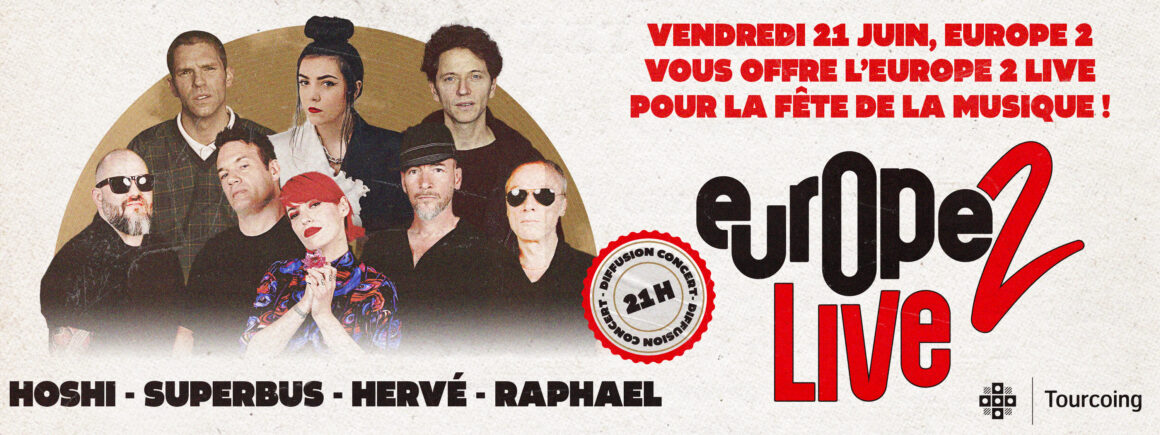 Ils ont fait vibrer la scène de l’Europe 2 Live, c’est maintenant à vous d’en profiter ! Le vendredi 21 juin, pour mieux célébrer la Fête de la Musique, revivez ce moment unique avec sur les ondes d’Europe 2 ! Au programme, Hervé, Superbus, Raphaël et Hoshi qui, le temps d’une soirée ont enflammé Tourcoing !