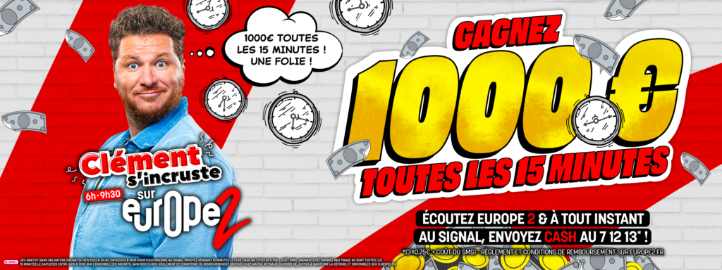 Sur Europe 2, on aime vous faire plaisir ! Et pour vous remercier de votre fidélité, Clément et toute l’équipe ont décidé de vous offrir 1000 euros toutes les 15 minutes !