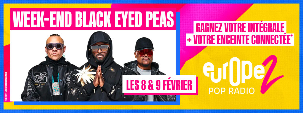 Pour avoir une chance de remporter l’intégrale des Black Eyed Peas mais aussi votre enceinte connectée, rien de plus simple : dès que vous les entendez sur Europe 2, envoyez le code BLACK par SMS au 7 12 13 (3x 0,75 cts + prix du SMS) ! Bonne chance à tous et surtout, ne faites pas l’impasse sur le règlement !