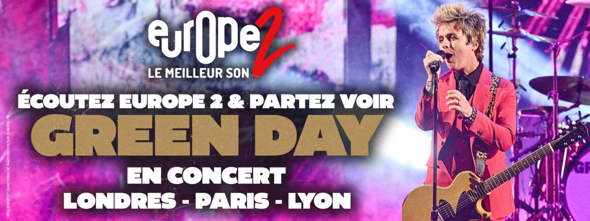 Pour partir assister à l’un des concerts évènement de Green Day, rien de plus simple : il vous suffit d’envoyer le code EUROPE 2 au 7 12 13 (3×0,75 cts + prix du SMS) ! Surtout, ne faites pas l’impasse sur le règlement !