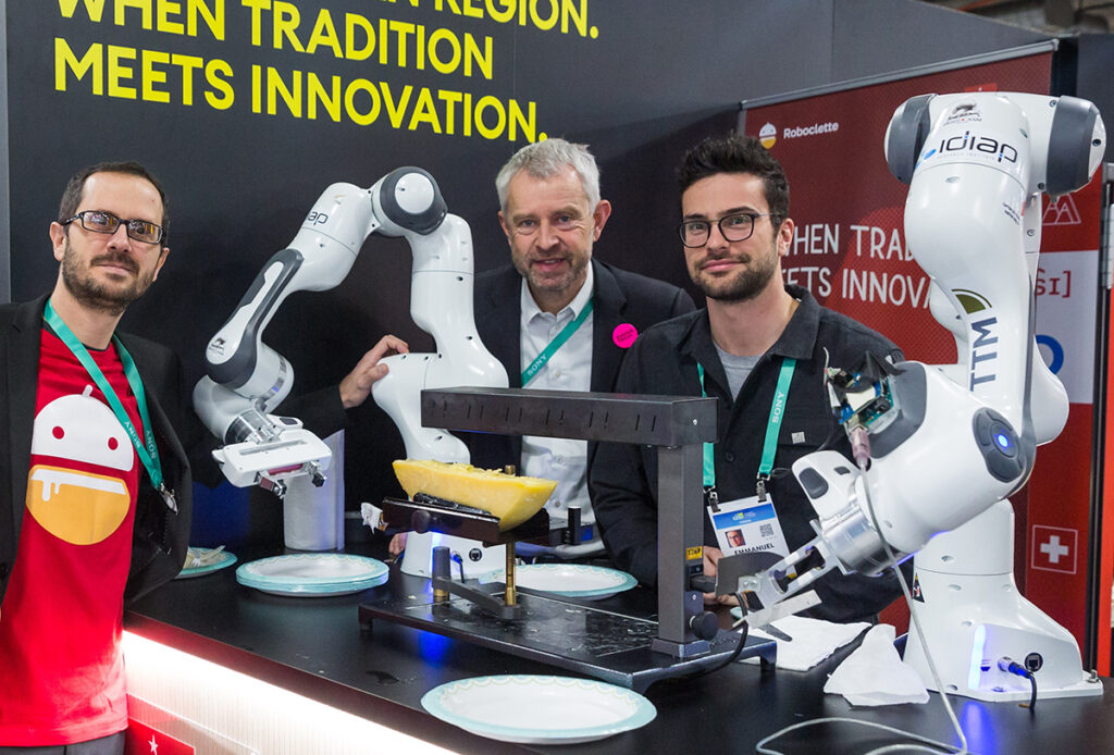 Le Roboclette a été imaginé par le doctorant suisse en robotique Emmanuel Pignat et l’ingénieur en robotique Sylvain Cullinon à l’Institut Idyap. Constituée de deux bras articulés, la machine maintient une moitié de meule de fromage tandis que l’autre bras le sert directement sur l’assiette lorsqu’elle est à température idéale.