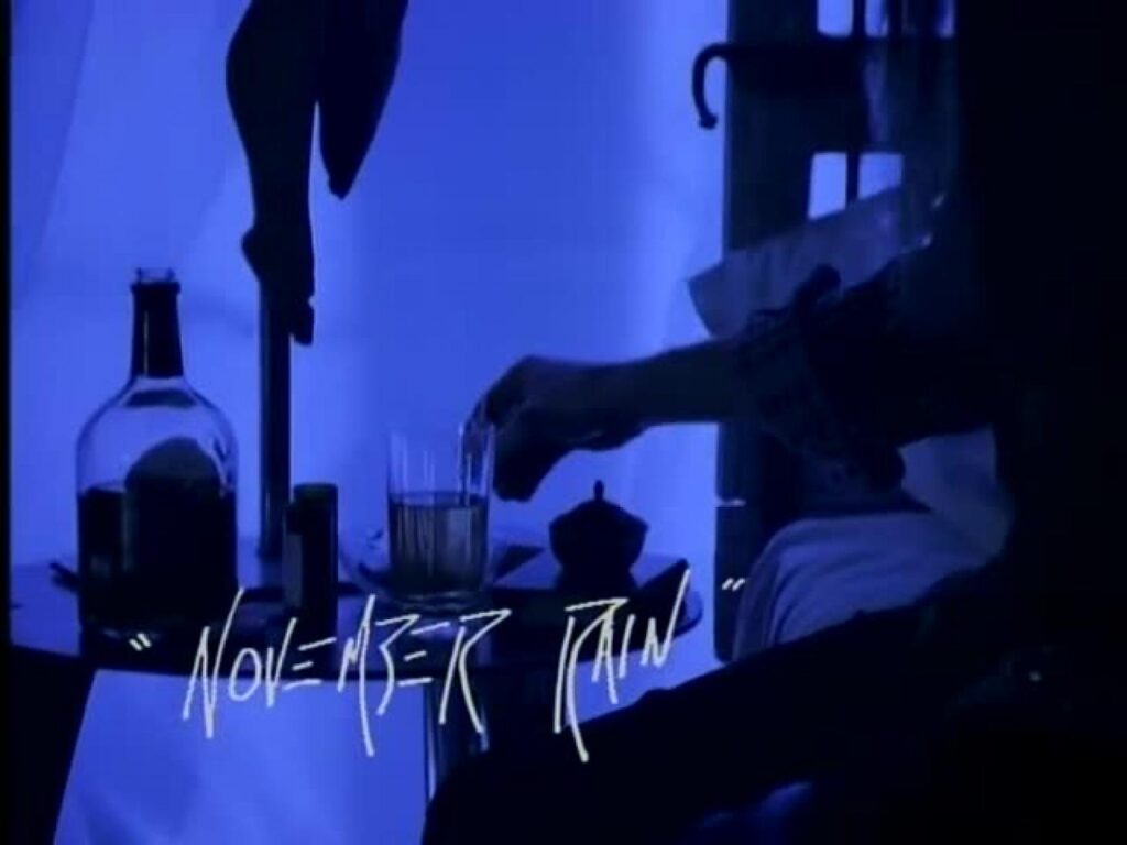 Lorsque le clip s’ouvre par exemple, on a droit à une image typique des années 90 : couleurs sombres, nom du titre inscrit en bas de l’image… jusque là, les Guns ont tout bon. Ce qu’il faut savoir, c’est que le clip est basé sur une histoire de Del James (un journaliste spécialisé dans le rock, ami d’Axl Rose), qui peut être trouvée dans The Language Of Fear. Et d’ailleurs, November Rain, Don’t Cry et Estranged forment une sorte de trilogie non-officielle (mais confirmée). Si le clip (impressionnant) à la narration riche en a surpris plus d’un, il reste marquant pour une raison : la mariée (interprétée par Stephanie Seymour) meurt à la fin. Et tout le mystère de la vidéo se trouve ici : pourquoi mais surtout, comment est-elle morte ?